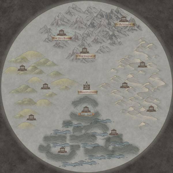 Er is een miniatuur van de zwevende tempel op de kaart. (3d) Raadsplateau ligt op de plek waar op de kaart een paleisje staat. Er zijn nog twee paleisgebouwtje. In die regio. Tor gravan is zichtbaar bij de bergen. Er staan nog twee paleisen tor dug badhir & tor za'hadum)
