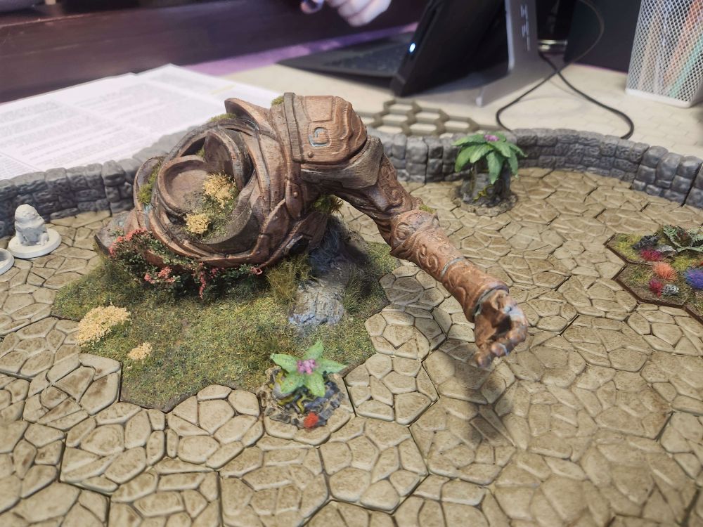 Dat ding (construct) staat in een bad van gesmolten en hard geworden steen? En er zitten beschadigingen op die lijken op die van luchtschepen die uit te strijd komen.
